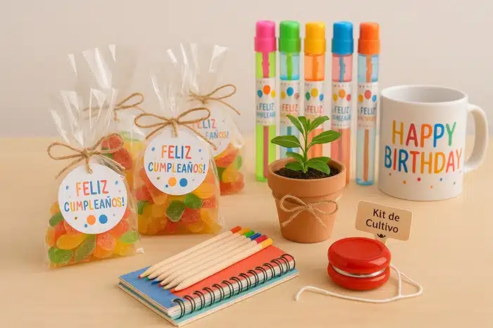 Los regalos personalizados son siempre una opción especial. Chapas, pulseras, libretas o etiquetas con el nombre del cumpleañero o la fecha del evento convierten cualquier objeto sencillo en un recuerdo significativo.